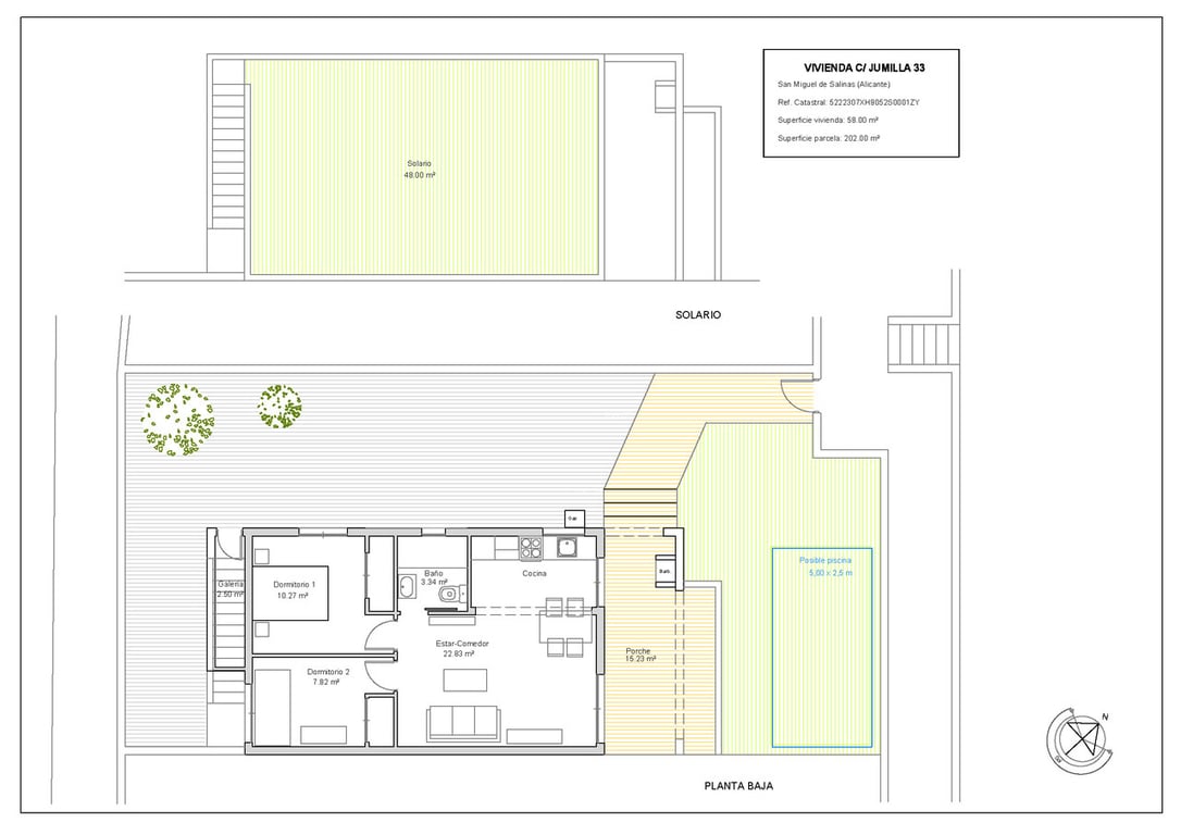 This charming renovated bungalow in Blue Lagoon offers a Mediterranean lifestyle in one of the quietest and most established areas of the Orihuela Costa. With 58 m² of living space, a private 48 m² solarium, and a generous 202 m² plot, it stands out for its exterior spaciousness and its 147 m² garden, perfect for enjoying the weather all year round. The fully renovated home features 2 bedrooms, 1 bathroom with a shower and screen, wood-effect laminate flooring, and a brand-new kitchen equipped with all appliances. The solarium has been tastefully finished with artificial grass and a brezo enclosure, provides an ideal space to relax in complete privacy. In addition, the large plot allows the future owner to install a private pool if desired (at their own expense).The location is unbeatable: just a few minutes from the El Limonar International School, several golf courses, the Villamartín shopping center, the Marimba Blue complex (with a pool, restaurant, and 3 paddle tennis courts), and the well-known Greenlands Blue Lagoon, with its spectacular mini-golf and thatched-roof restaurant.