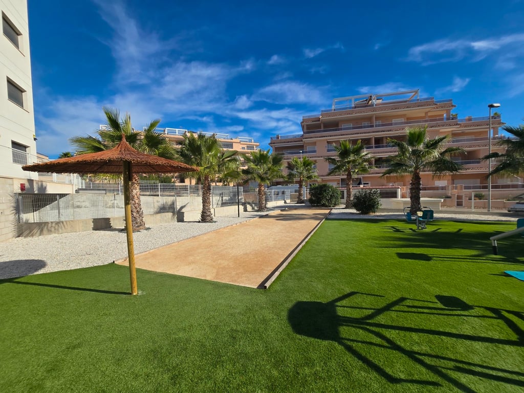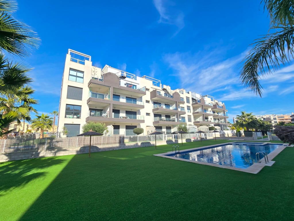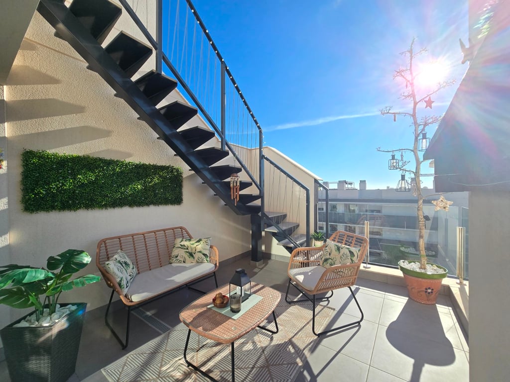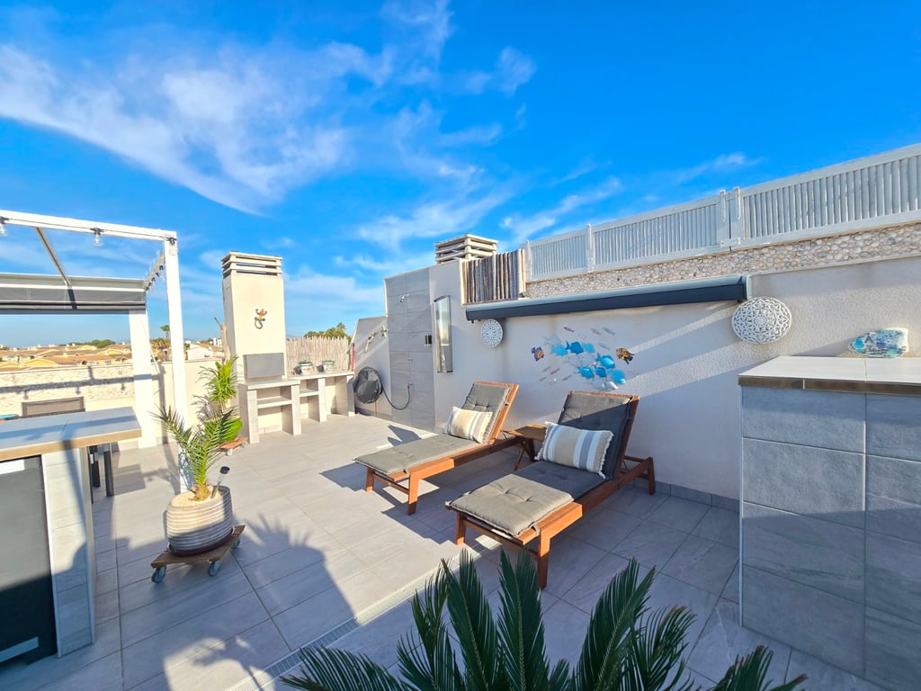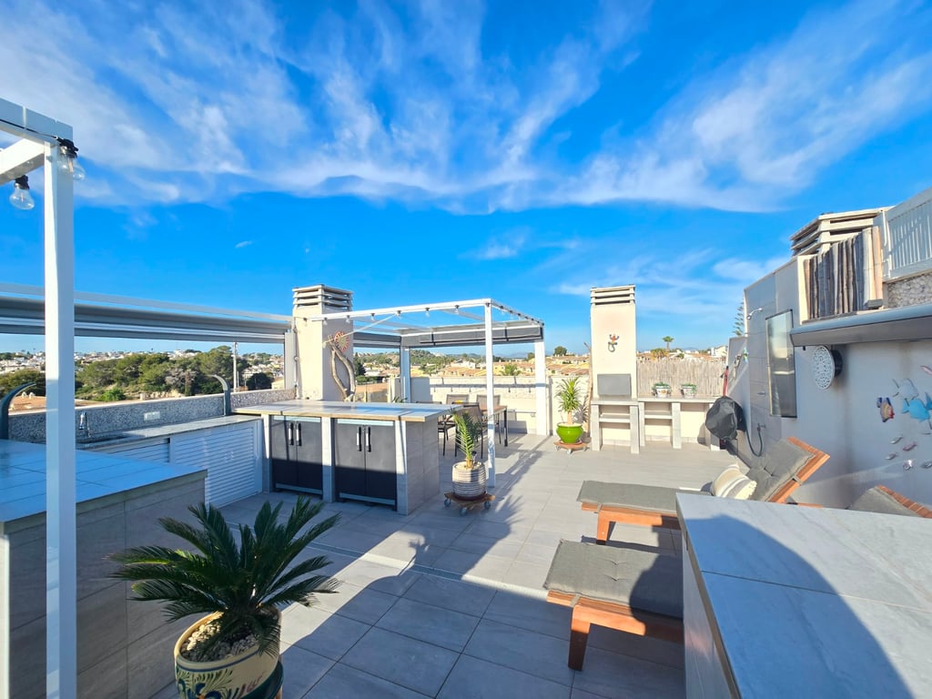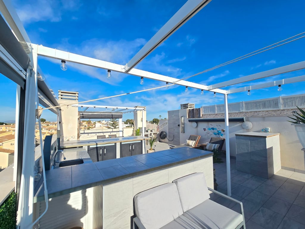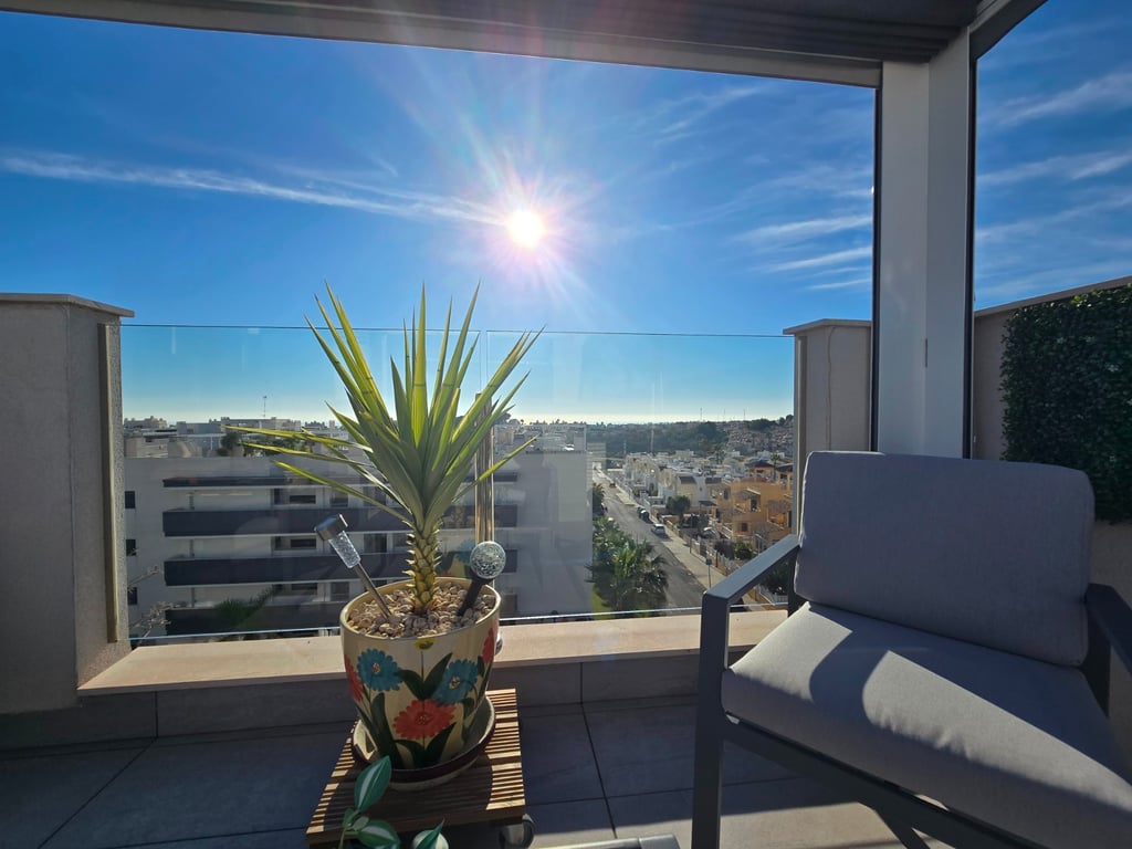 Ontdek dit uitzonderlijke zuidgerichte penthouse met adembenemend zee- en bergzicht, gelegen in een jonge en perfect onderhouden urbanisatie nabij de Golf van Villamartin. Het absolute pronkstuk is het ruime solarium, uitgerust met een volledig ingerichte buitenkeuken, een eet- en loungehoek en zonneterrassen waar je de hele dag door kunt genieten van licht, rust en panoramische vergezichten. Binnen verwelkomt een lichte en ruime leefruimte met open keuken je in een moderne, uitnodigende sfeer. Het penthouse beschikt over twee slaapkamers en twee badkamers, waarvan één en-suite, ontworpen met hoogwaardige materialen en een praktische indeling. Extra comfort vind je in de ondergrondse parkeerplaats (met pre installatie voor elektrische wagen) en twee afzonderlijke bergingen, ideaal voor extra opslag. De urbanisatie zelf biedt een waaier aan faciliteiten: twee zwembaden, een jacuzzi, een buiten gym, een petanquebaan, speeltuin voor de aller kleinste en prachtig aangelegde gemeenschappelijke zones. Alles ligt bovendien op wandelafstand van bars, restaurants en andere voorzieningen, waardoor ontspanning en gemak steeds binnen handbereik zijn. Ter extra’s heeft de woning zonneluifels, wind schermen, water ontkalker + OSMOSE en wordt deze volledig gemeubeld verkocht! Dit penthouse combineert luxueus wonen, comfort en topligging aan de Costa Blanca — perfect als permanente woonst, vakantieverblijf of investering. Twijfel niet een boek snel een bezichtiging! Suma: 249 euro/jaar. Gemeenschapskosten: 920 euro/jaar.