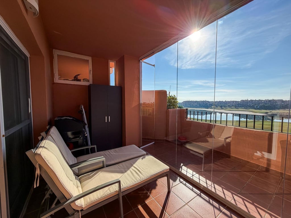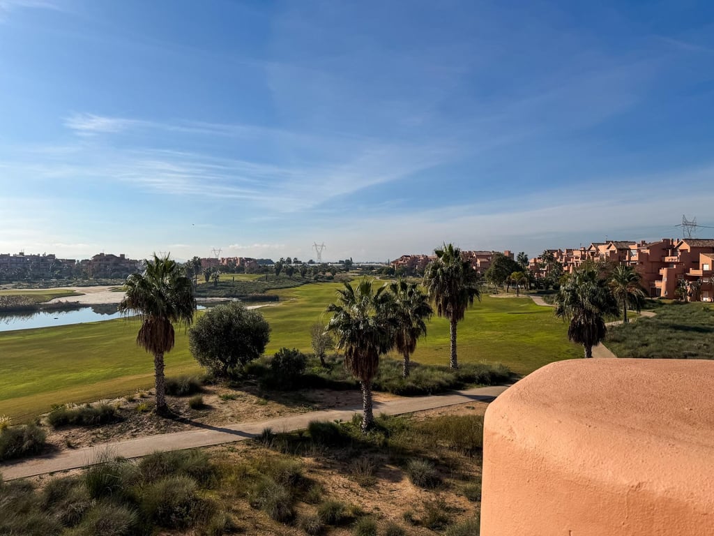 Frontline Golf Appartement met Uitzicht op het Meer – Mar Menor Golf Resort Dit 2-slaapkamer, 2-badkamer appartement is gelegen frontline aan de golfbaan binnen het prestigieuze Mar Menor Golf Resort en biedt open uitzichten over de fairways en het meer. Dankzij de zuidoriëntatie geniet het appartement van veel natuurlijk licht gedurende de hele dag. De woon- en eetruimte geeft direct toegang tot een privéterras, perfect om buiten te eten met uitzicht op de golfbaan. Beide slaapkamers zijn ruim en voorzien van ingebouwde kasten. De twee badkamers zijn modern en praktisch afgewerkt. De woning is ideaal als vaste woning, vakantieverblijf of investering met goede verhuurmogelijkheden. Een privé garageplaats is inbegrepen. Gelegen in een beveiligd en goed onderhouden resort met 18-holes golfbaan, hotel, restaurants en vlotte verbindingen naar de stranden van de Mar Menor en de Costa Cálida.