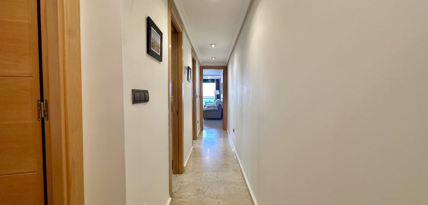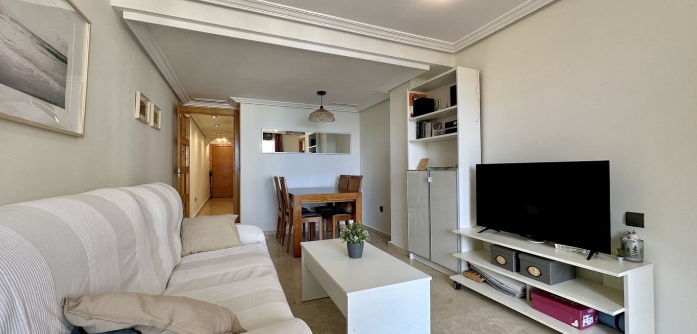 Ontdek dit lichte en comfortabele appartement op slechts 100 meter van de zee, in een van de beste wijken van Guardamar. Gelegen op de tweede verdieping met lift, oostelijk georiënteerd, met prachtig zeezicht vanuit de woonkamer en de hoofdslaapkamer. De woning biedt 78 m² met een ruime woonkamer, volledig uitgeruste moderne keuken met Silestone werkblad, inductiekookplaat, vaatwasser, osmosekraan, platte afzuigkap en een ruime voorraadkast met automatische verlichting. Twee slaapkamers en twee badkamers, waarvan één en-suite met bad. De andere badkamer heeft een hydromassage douchekolom en thermostaatkranen. Schuifdeuren zorgen voor optimaal ruimtegebruik. Extra’s: inbouwkasten, LED-verlichting, vernieuwde centrale airconditioning, nieuwe matrassen, LED-TV’s, internet, kluis, vernieuwde zonwering, grote berging en garageplaats. Dicht bij restaurants, supermarkten en scholen — en slechts 100 meter van de zee. Perfect voor een ontspannen mediterrane levensstijl.