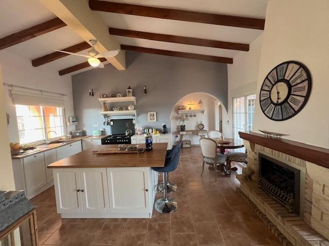 Stunning country house in Dolores, ALICANTE with 3 double bedrooms, 2 bathrooms, 2 walk-in wardrobes, lounge/diner with fireplace open kitchen, separate preparation kitchen, study andsecond lounge with access to decking area to the garden. The villa is on a fenced plot of 6,300m with a 10 x 5m pool with large terrace surround. Ideally situated in a peaceful rural setting although close to town and only 15 mins’ drive to beaches and 35 mins to the airport of Alicante/Elche. Enjoy the superb views from the rooftop sun terrace. Mains water and electricity via solar panels with back up generator.