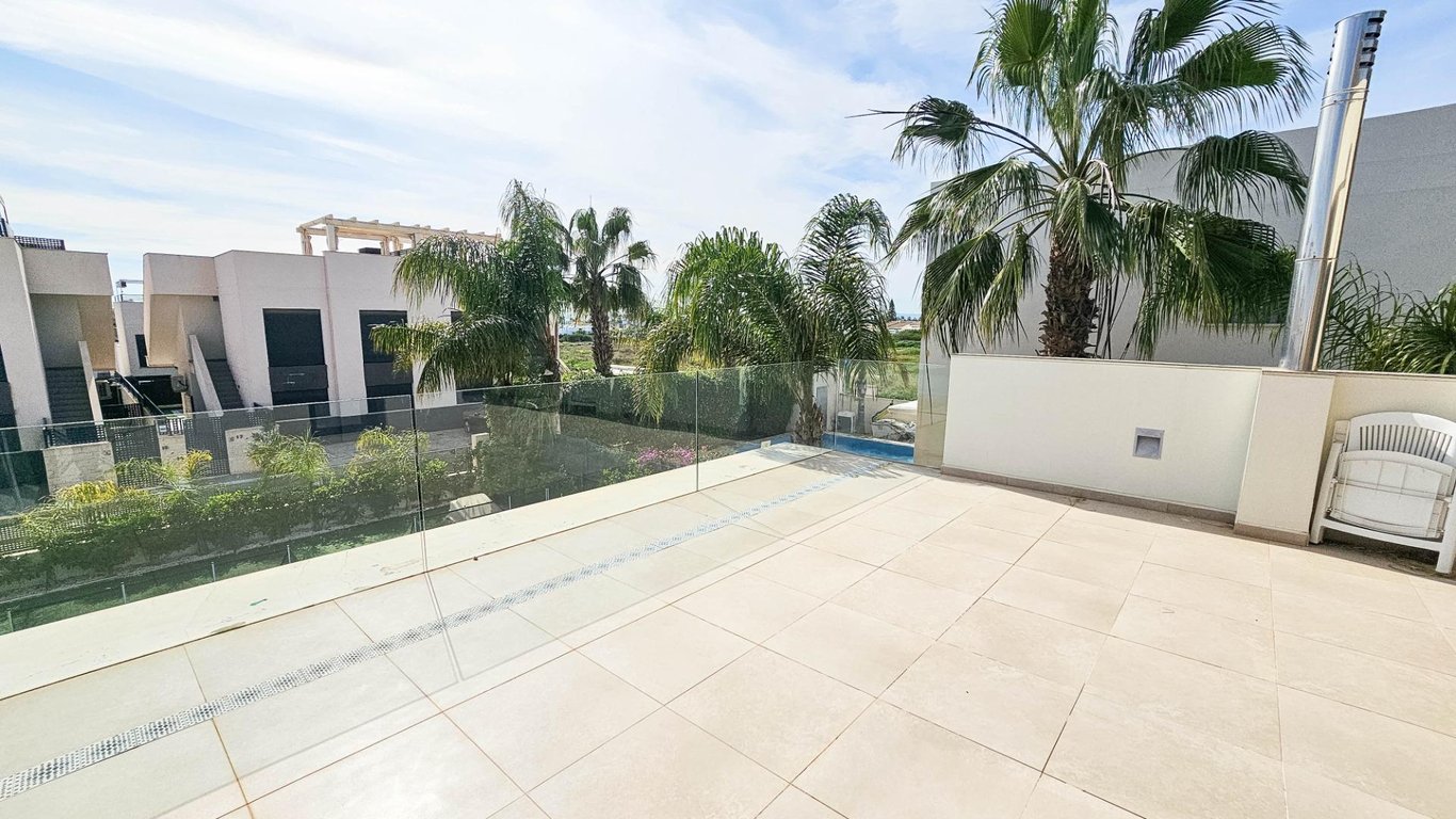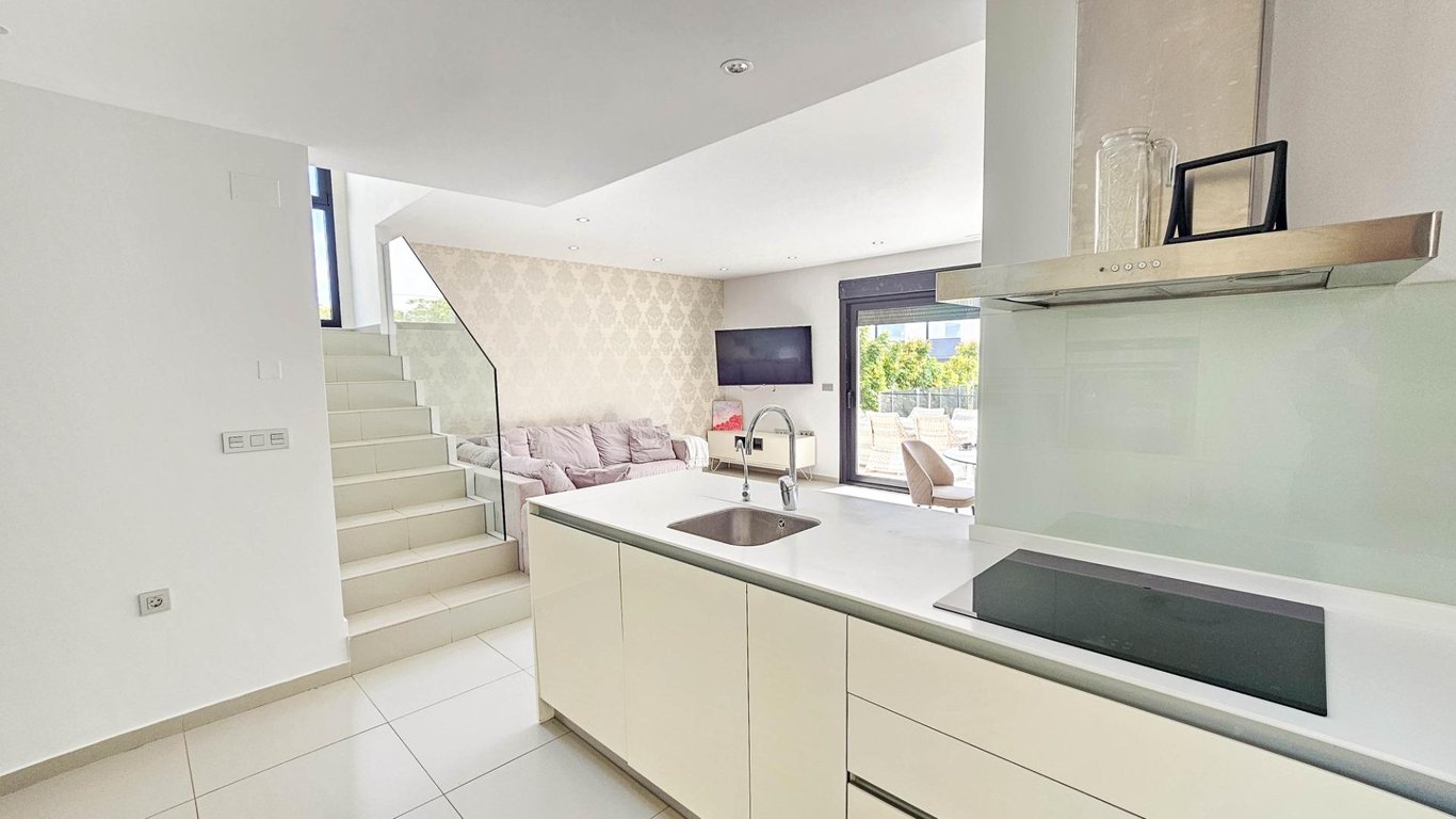 Wij presenteren deze prachtige villa in moderne stijl, gelegen in een rustige en goed verbonden woonwijk — een ideale plek voor wie comfort, privacy en een hoge levensstandaard waardeert. Gebouwd in 2014, combineert dit pand modern design met hoogwaardige materialen en een doordachte indeling die optimaal comfort in elke kamer biedt. De villa heeft een totale bebouwde oppervlakte van 125 m² op een perceel van 300 m². Het huis beslaat twee verdiepingen met een ruim dakterras — een perfecte plek om te zonnebaden en het hele jaar door van het uitzicht te genieten. Op de begane grond bevindt zich een lichte en ruime open woonkamer met eetgedeelte, verbonden met een volledig uitgeruste moderne keuken. Hier bevindt zich ook de hoofdslaapkamer met inloopkast, een complete badkamer en een gastentoilet, allemaal met directe toegang tot de tuin en het privézwembad. Op de eerste verdieping zijn nog twee grote slaapkamers en een extra badkamer, allemaal gevuld met natuurlijk licht en met toegang tot een privéterras. Een buitentrap leidt vanaf deze verdieping naar het solarium, een privéruimte voor ontspanning, gasten ontvangen of genieten van het mediterrane klimaat. De villa is uitgerust met centrale airconditioning, vloerverwarming door het hele huis en wordt volledig gemeubileerd verkocht, klaar om in te trekken. De buitenruimte combineert ontspanningszones met een prachtig privézwembad, ideaal voor het genieten van buitenlucht in volledige privacy. Daarnaast is er een parkeerplaats op het perceel, wat gemak en veiligheid garandeert. De moderne architectuur, hoogwaardige afwerking en ruime interieurs maken deze villa een uitstekende keuze voor permanent wonen of als vakantiehuis. Deze villa belichaamt de essentie van Mediterrane comfort: ruimte, licht, stijl en een uitstekende locatie in een rustige en praktische buurt. Een perfecte woning voor wie wil genieten van zon, privacy en luxe.