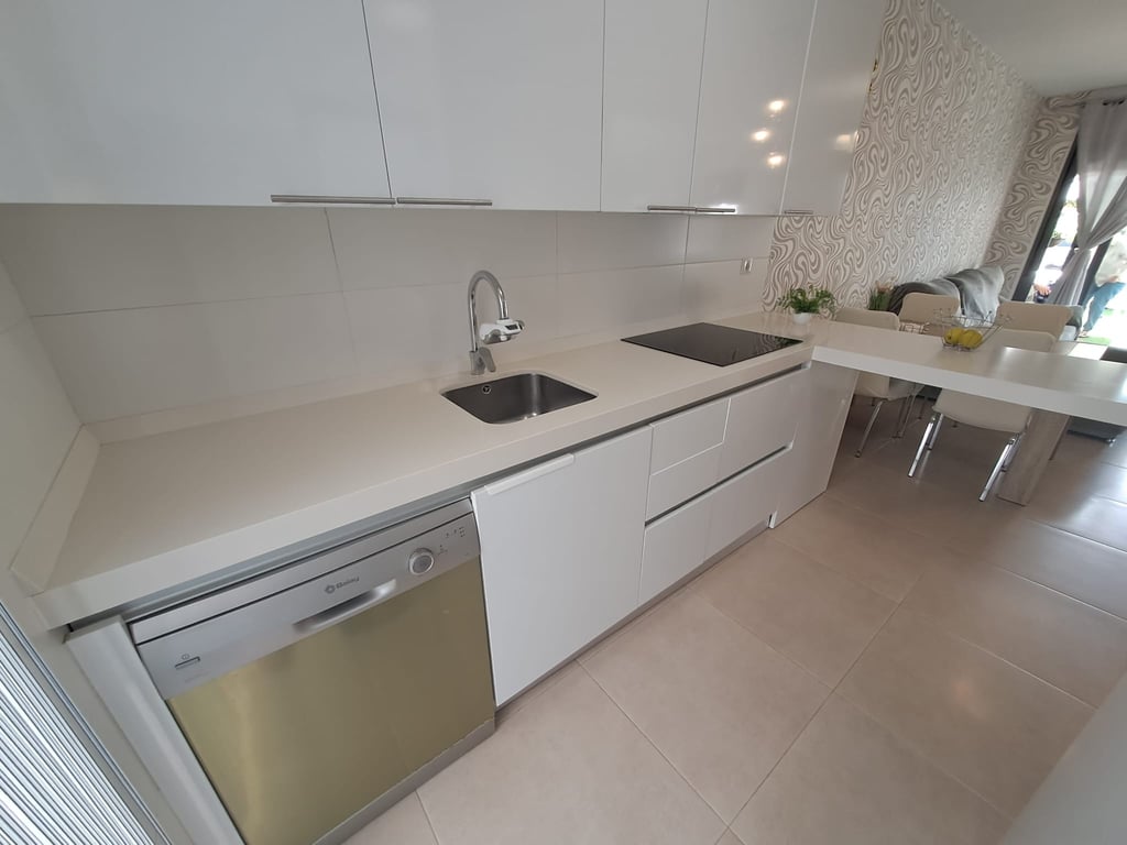 A modern townhouse for sale with a built area of 197 m². The duplex offers three bedrooms, three bathrooms, and an open-plan kitchen combined with the living room. The kitchen has access to a private patio, while from the living room there is a staircase leading down to the basement level, where the garage is located. A rooftop solarium is situated on the roof, and there is an additional terrace at the entrance to the house.The residential complex features two swimming pools (a standard pool and a heated pool).The distance to the sea is 3 km.Online reservation is available, as well as mortgage financing from the bank at an annual interest rate of 4–6%.