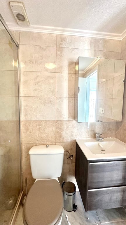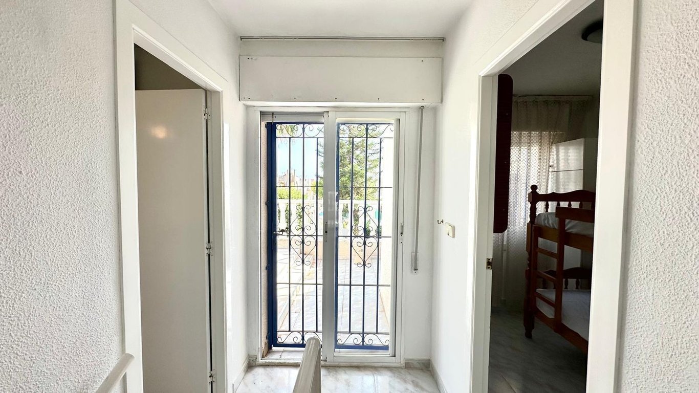 Charming Townhouse with Private Solarium and Communal Pool in Doña Inés Urbanization – Torrevieja We present this fantastic townhouse located in the exclusive and quiet Doña Inés Urbanization, one of the most desirable areas of Torrevieja, ideal for those looking to live in a safe, peaceful environment with all amenities just minutes away. The property has 80 m² of built area and stands out for its excellent layout and spacious outdoor space. A cozy private garden surrounds the home, perfect for enjoying al fresco meals, creating a chill-out area, or simply relaxing in the sun. It also has a storage room, ideal for additional storage. Upon entering the home, we find a very bright living-dining room with a perfectly integrated open-plan kitchen, offering a modern, practical, and functional space. On this same floor, there is a full bathroom with a shower and a double bedroom, ideal as a guest bedroom, office, or master bedroom on the ground floor. Going up to the second floor, we find a single bedroom, another full bathroom with a shower, and the master bedroom, which stands out for its spaciousness and direct access to a beautiful terrace overlooking the communal pool, a perfect space to relax and enjoy the surroundings. As a finishing touch, the property features a private solarium on the upper floor, ideal for sunbathing, hosting barbecues, or enjoying quiet moments with unobstructed views. The Doña Inés development offers its residents a communal pool, perfect for cooling off on summer days and enjoying a relaxed, family-friendly atmosphere. An ideal opportunity for those looking for a ready-to-move-in home with spacious outdoor spaces, a private solarium, and a communal pool, located in one of the most sought-after areas of Torrevieja.