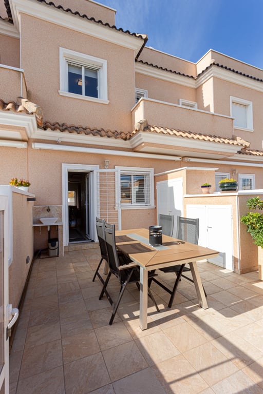 Geschakelde woning te koop in Orihuela Costa, gelegen in de populaire residentiële wijk Lomas de Cabo Roig, in het zuiden van de Costa Blanca. Deze woning bevindt zich in een rustige en goed onderhouden omgeving, terwijl alle voorzieningen, stranden en golfbanen zich op korte afstand bevinden.De woning beschikt over 3 slaapkamers en 2 badkamers en wordt volledig gemeubileerd en uitgerust verkocht, inclusief Bosch huishoudtoestellen. Verder beschikt de woning over vloerverwarming in de badkamers en de woonkamer, evenals meerdere buitenruimtes om het hele jaar door van het mediterrane klimaat te genieten.Deze geschakelde woning is verdeeld over twee verdiepingen en biedt ruime terrassen, een privé solarium en moderne comfortvoorzieningen.Lomas de Cabo Roig is een van de meest gewilde woongebieden van Orihuela Costa, bekend om zijn nabijheid tot de stranden van Campoamor, de golfbanen en het aangename woonklimaat.De woning is ideaal gelegen nabij stranden, golf, winkelcentra en alle essentiële voorzieningen, wat deze woning geschikt maakt voor permanente bewoning, vakantiegebruik of als investering.Toplocatie in Lomas de Cabo Roig, Orihuela CostaDeze geschakelde woning is gelegen in Lomas de Cabo Roig, een gevestigde residentiële wijk dichtbij de stranden van Campoamor, Cabo Roig en La Zenia, evenals diverse gerenommeerde golfbanen zoals Campoamor Golf, Las Ramblas en Villamartín Golf.De omgeving biedt uitstekende infrastructuur, een rustige woonomgeving en een snelle toegang tot alle dagelijkse voorzieningen, wat dit tot een van de aantrekkelijkste gebieden van Orihuela Costa maakt.Geschakelde woning met terrassen en functionele indelingOp de begane grond beschikt de woning over twee ruime terrassen, één aan de voorzijde en één aan de achterzijde, ideaal voor buiten dineren, ontspanning of gezellige momenten met familie en vrienden.Op deze verdieping bevinden zich tevens een lichte woon- en eetkamer met vloerverwarming, een volledig uitgeruste keuken met Bosch apparatuur en een slaapkamer van 8,6 m² met ingebouwde kast en airconditioning via splitunit. De begane grond is uitgerust met infraroodverwarming.Eerste verdieping met slaapkamers, badkamer en terrasDe eerste verdieping beschikt over een ruime badkamer met ligbad, radiatorverwarming en een raam voor natuurlijke lichtinval. Daarnaast is er een slaapkamer van 8 m² met ingebouwde kast en een hoofdslaapkamer van 10,1 m² met airconditioning en directe toegang tot een privéterras van 9,1 m².Vanuit dit terras leidt een trap naar het privé solarium van circa 30 m², een perfecte plek om te zonnen, een chill-out zone te creëren of ligbedden te plaatsen.Dicht bij stranden, golf en winkelcentraDe woning ligt op korte rijafstand van de stranden van Campoamor en Cabo Roig, bekend om hun fijne zand en heldere water. Ook meerdere topgolfbanen bevinden zich in de directe omgeving.Supermarkten, restaurants, bars en apotheken zijn gemakkelijk bereikbaar, terwijl het populaire winkelcentrum :contentReference[oaicite:0]{index=0} zich op slechts enkele minuten rijden bevindt.Ideale woning om te wonen of te investerenDankzij de uitstekende ligging, de buitenruimtes en de volledige uitrusting is deze geschakelde woning in Lomas de Cabo Roig ideaal als permanente woning, vakantiewoning of als investering met hoge verhuurvraag in Orihuela Costa.Vastgoed in deze regio blijft zeer gewild en biedt een stabiele waarde op lange termijn, wat deze woning tot een veilige investering aan de Costa Blanca Zuid maakt.