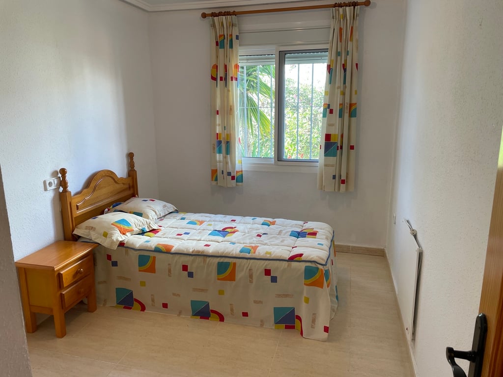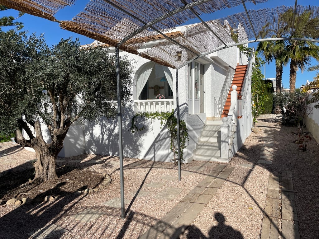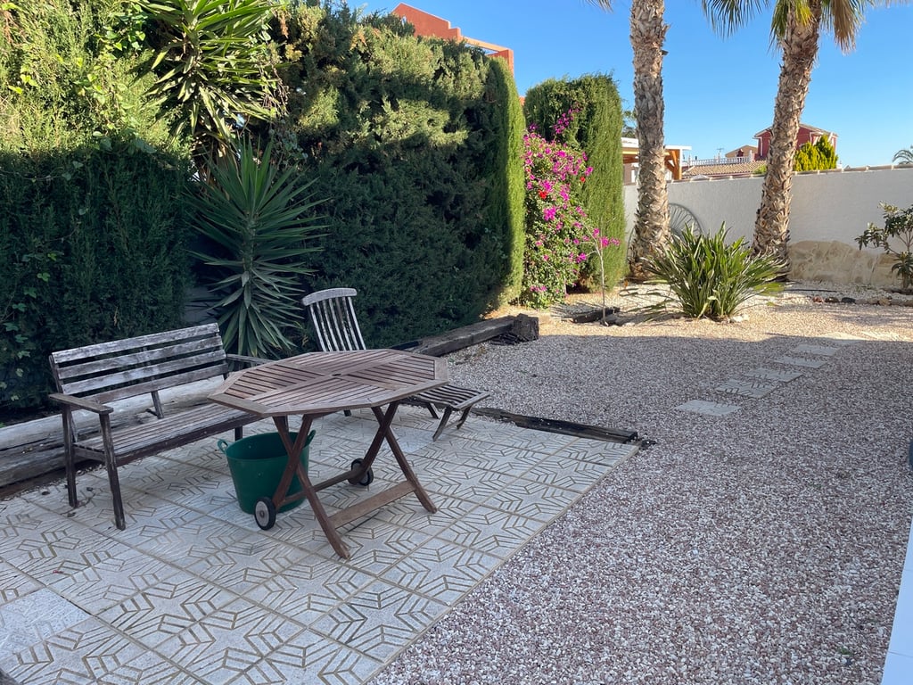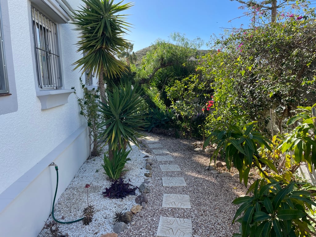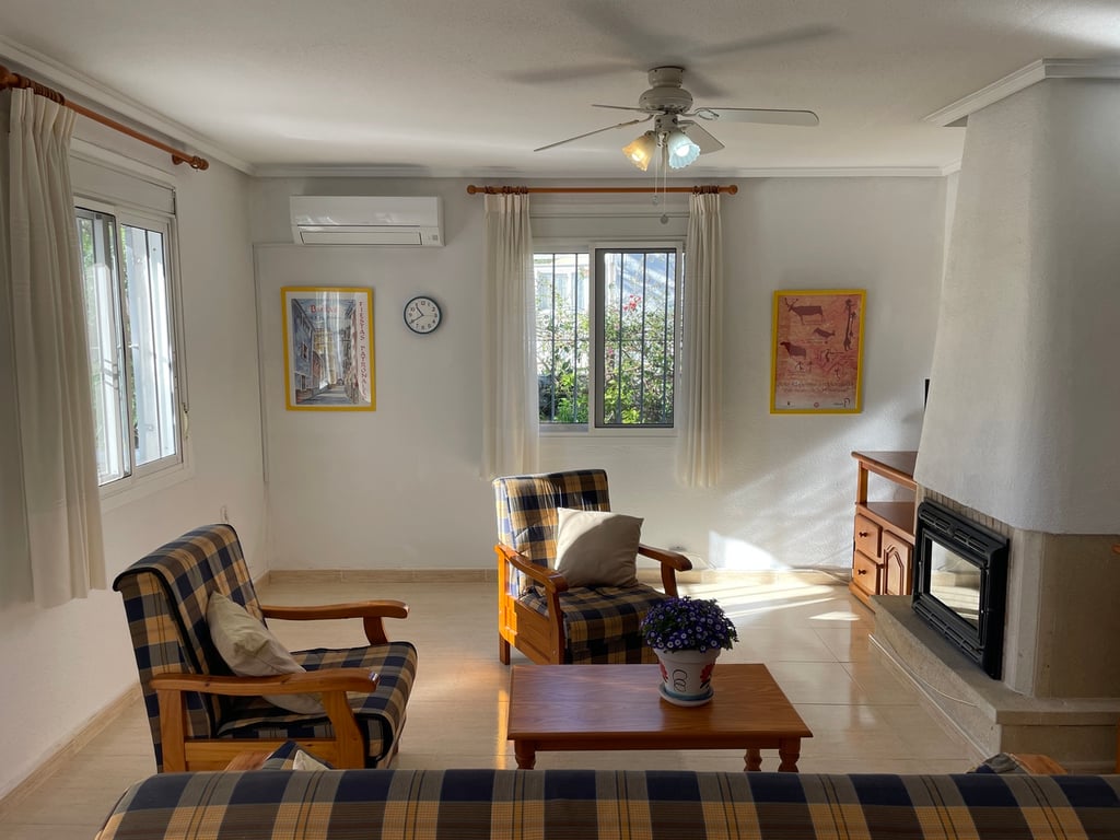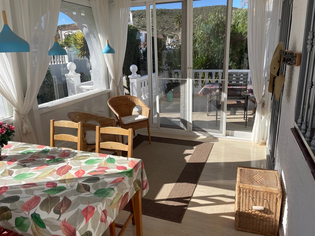 A very well maintained, south facing, 2 bedroom, 2 bathroom detached Rosa model villa with air-conditioning, fireplace, solarium, under-build and a beautiful mature garden on the final phase of Camposol in Mazarron, Murcia. Situated on a plot of 400 sqm and with a living space of 93 sqm, the property is located on a quiet residential street.Upon entering the property, you have a front sunny terrace that is half glazed and half open with sliding doors, windows, awning and fly-screens. The light and airy open plan lounge has a wood burning fireplace, ceiling fan and dual air-conditioning with an archway to dining area and a fully fitted kitchen with wooden upper and lower units, plenty of work surfaces, oven, hob and extractor fan and comes complete with all white goods. The kitchen has the bonus of a close-in boiler that offers instant hot water. Two double bedrooms, the master bedroom has an en-suite fully tiled bathroom with bath and overhead shower, sink, bidet and cupboard unit. There is a further tiled bathroom with an enclosed shower unit adjacent to the other bedroom and this also houses the washing machine. Both bedrooms have ceiling fans and fitted wardrobes.The beautiful mature garden has many lovely plants, trees and shrubs including mango, peach and olive to name a few. The water is fully irrigated and can operate on a timer. There is a good size 3 x 4 shed plus further storage under the stairs to the solarium and off-road parking. The large solarium, with storage, affords great views to the surrounding mountains. The property is being sold furnished and with all white goods. The large under-build, which is 6 foot high and currently used as storage, could be converted to a games room or as further accommodation if one wished. The property has fly-screens and panel heaters throughout plus 3 solar panels on the solarium.Camposol is located 15 minutes from the blue flag beaches of Puerto de Mazarron and Bolnuevo. The international airport at Corvera in Murcia is just 20 minutes away and Alicante airport 70 minutes. In addition to the 18 hole golf course within Camposol, there is the Jack Nicklaus Signature course 10 minutes away in Alhama de Murcia.Camposol has a selection of shops, bars, restaurants, banks, dentists, health clinic, cultural centre, petrol station and lots of activities for adults and children. Camposol is divided into four sectors, A, B, C and D with approx. 4,000 properties spread across these sectors. You have two Commercial Centres on A and B, where you will find all the bars, restaurants and entertainment.
