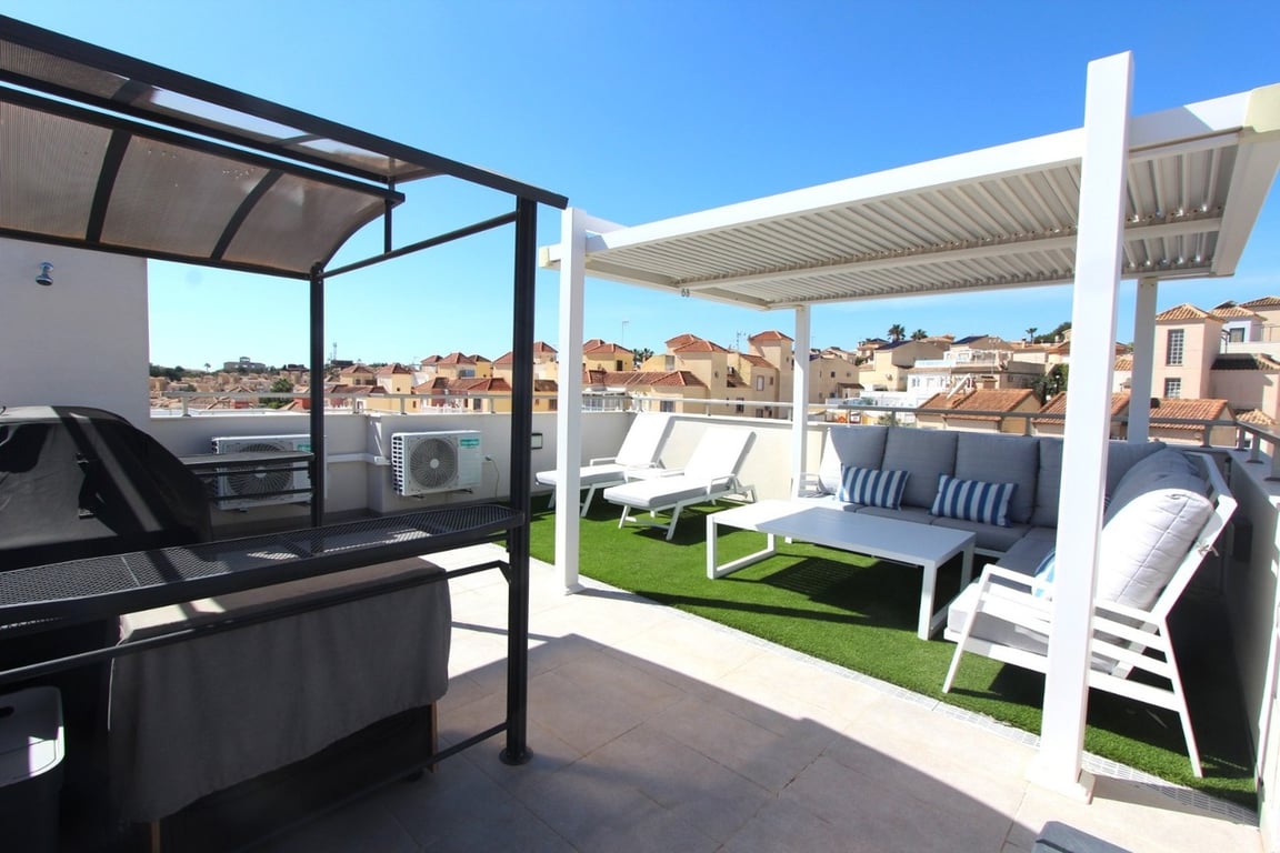 Completed in 2022, this fabulous 3 bed (potentially 5), 4 bath contemporary style new-build villa is the finest example of the Don Benito style villas, incorporating every conceivable ‘extra’ and the very highest specification.  Conveniently located in the El Galan urbanisation nr Villamartin and close to all amenities and numerous golf courses, it’s situated only a few minutes to both the Villamartin Plaza and La Fuente Commercial Centre as well as being less than a 7 minute drive from the fabulous La Zenia Boulevard and those amazing Costa Blanca beaches!Internally, this incredible property comprises two stories with an additional under-build and rooftop solarium, all of which benefit from hot/cold air conditioning.  On the ground floor you will find one of the three double bedrooms together with a full family bathroom including shower. There is a spacious open-plan kitchen and dining area incorporating a well appointed modern kitchen equipped with all of the modern facilities you would expect and giving access out to the covered utility and storage area which also houses a washing machine.  The lounge area enjoys full height, double-glazed sliding doors along the length of the external wall giving direct access out onto the sun drenched covered terrace area and large 6x3m private swimming pool.  Fully tiled and privacy screened, the outside area offers usable space around the entirety of the property and incorporates a useful utility area to the rear as well as a covered car parking space and driveway to the left of the villa.  This outside space is what Spanish living is all about – sunshine, socialising and relaxing with a fantastic pool (with outdoor shower) to take a dip in when the sunshine gets too much!Stairs lead to the first floor accommodation which features two double bedrooms both of which benefit from their own en-suite bathrooms, fitted wardrobes and retractable insect window screens.  The master bedroom also offers access via glazed sliding doors onto a private balcony – the perfect spot to enjoy your morning cafe au lait.  A second internal stairway leads to the amazing private rooftop solarium complete with aluminium pergola for shade, a BBQ area also complete with pergola and a handy shower area.  This privileged spot offers the perfect relaxation and entertaining space with views across the parkland – as well as guaranteeing the perfect year round sunbathing spot.In addition to the superb internal and outdoor living accommodation, this fantastic villa also benefits from an incredible 56 sqm under-build which was a built as part of the original construction as a developer ‘extra’.  This incredible space is fully finished and comes complete with a fully fitted bathroom.  Currently being used as a workshop and a music & cinema room, this space offers the flexibility to be used as additional self-contained guest accommodation and would easily provide two further bedrooms in addition to the existing three, potentially making this a five bedroom, four bathroom luxury home…….  Or you could just leave it as every husbands (and wife’s!) dream ‘Man Cave’!Location, quality and value combine to make this property a truly exceptional prospect for anyone seeking the ultimate villa with easy access to all that the Costa Blanca has to offer – walking distance to the best bars, restaurants and shopping and only a few minutes drive from the Mediterranean and  those golden beaches – what more could you want?The property comes part furnished with most items included as shown.