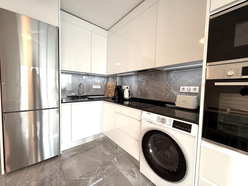 A rare opportunity to purchase a fully renovated apartment on the front line of the sea in one of the most sought-after areas of Torrevieja. The Miramar XII complex is located in Cabo Cervera, a quiet residential area with direct access to the sea that combines tranquillity with proximity to all necessary amenities. The main advantage of this apartment is its unique location. The sea is just 10 metres away, the sandy beach around 50 metres. These are not side or partial views, but full frontal views of the Mediterranean Sea directly from the living room. The south-facing orientation of the apartment ensures maximum sunlight throughout the day: mornings are bright and warm, and evenings offer the chance to watch the sun paint the sea surface in golden hues. Such apartments rarely come up in this complex, as most are oriented towards the interior or have only partial views. A south-facing aspect with direct sea views is exactly what buyers are looking for and what is valued in the rental market. The Cabo Cervera area enjoys steady demand both from buyers seeking permanent seaside living and from investors focused on tourist rentals. It is quiet here, with no noisy bars or nightclubs, yet supermarkets, pharmacies, restaurants and public transport stops are all within walking distance. The centre of Torrevieja can be reached in just a few minutes by car or by using public transport. The apartment has undergone a complete renovation with replacement of all utilities and finishing materials. This is not a cosmetic update or a budget refurbishment for letting purposes — it is a thorough reconstruction, done properly and built to last. One need only look at the photographs to appreciate the level of workmanship: quality tiles, solid plumbing, well-considered details. Everything has been done solidly, using materials that will not need replacing after a couple of seasons. The air conditioning system has been completely replaced — a new LG air conditioner with inverter control has been installed, providing comfortable temperatures both in summer heat and during the cooler winter months. The kitchen is fully equipped: new furniture has been installed, the worktop is made of stone, the stainless steel sink is undermounted, and the tap is modern and chrome-plated. Next to the sink there is a draining area. Kitchen sockets are installed for connecting appliances — everything has been thought through. The bathroom has been completely refurbished and looks like something from a premium new-build development. The walls and floor are clad in large-format tiles with a white marble effect, which visually expands the space and gives the room a sense of cleanliness and light. A shower cabin has been installed with sliding glass doors and a thermostatic mixer tap allowing precise temperature control. The wall-hung vanity unit with basin has ample storage space, and above it is a mirror with integrated LED perimeter lighting. For hot water supply, a Ferroli electric water heater with digital control has been installed. This is reliable European-made equipment that ensures a stable hot water supply and allows energy consumption to be monitored. The apartment includes a separate bedroom and bathroom. One needs to understand the specifics of such coastal complexes: bedrooms here are traditionally compact, as the main living area is given over to the lounge zone with access to the sea. This is a characteristic feature of coastal apartment architecture, where the emphasis is on views and proximity to the water rather than bedroom size. That said, the bedroom is fully functional — it comfortably accommodates a double bed with bedside lamps and a chest of drawers for linen. In the hallway there is a shoe cabinet and coat hooks, and on the floor is quality grey marble-effect tiling that runs throughout the apartment, creating a unified visual space. All furniture is new and included in the price of the apartment. The interior is decorated
