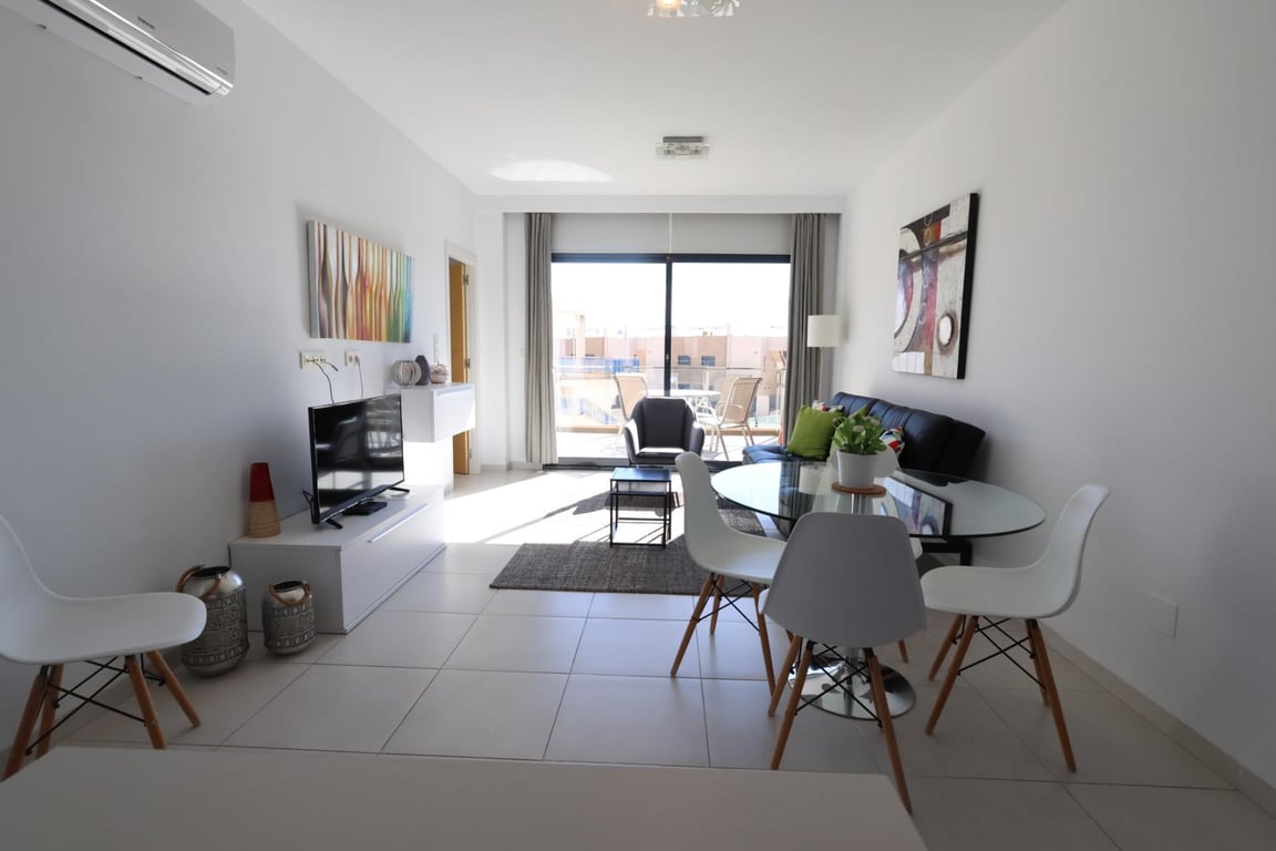 Dit zuidoostelijk gelegen appartement van 71 m2 beschikt over 2 slaapkamers (waarvan 1 en-suite), 2 badkamers, een ruime woon-eetkamer, een open keuken en een terras. De woning wordt gemeubileerd verkocht en is voorzien van individuele airconditioning (warm/koud) in alle ruimtes. Het complex beschikt over gemeenschappelijke tuinen, een zwembad, berging en privéparking. Het appartement heeft een toeristenvergunning en levert uitstekende huuropbrengsten op.. . Basiskenmerken. . 71 m2 bebouwd 10 m2 terras. . 2 slaapkamers 2 badkamers. . Parkeerplaats inbegrepen Bouwjaar 2015. . Oriëntatie zuidoost Privé berging. . Voorzieningen. . • Airconditioning warm/koud. . • Zwembad en kinderzwembad. . • Dicht bij winkelcentrum, restaurants en bars