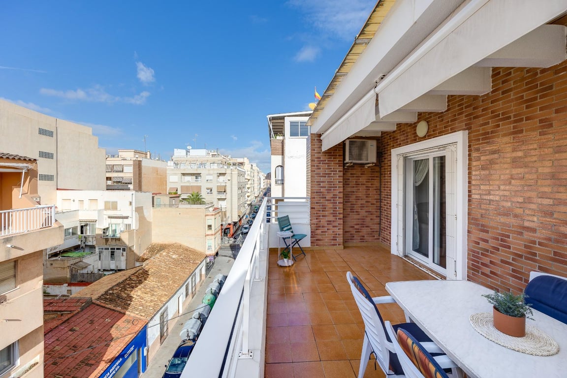 We present to you this charming penthouse apartment located in the heart of Torrevieja, just 200 meters from the beach and 30 meters from the Ermita de Torrevieja, surrounded by all necessary amenities such as supermarkets, bus stops, seaside promenades, restaurants, bars, beaches, and more. The property, located on the fourth floor with an elevator, offers a beautiful panoramic view thanks to its height. The building also has access for people with reduced mobility and an elevator. The apartment is distributed into two spacious double bedrooms, two full bathrooms, a fully equipped independent kitchen with access to a small utility gallery, and a cozy living-dining room with direct access to an impressive terrace that is sunny all day long due to its orientation—perfect for relaxing and enjoying the views. Additionally, the building offers a communal solarium where the private storage room of the apartment is located, providing extra storage space. Don’t miss this opportunity to live in a prime location near the sea, with all conveniences within reach. Ideal for enjoying the best lifestyle in Torrevieja!