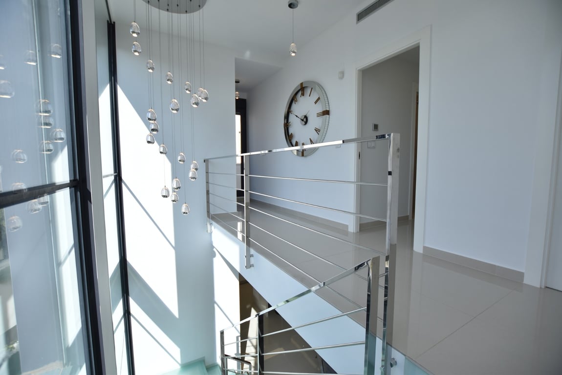 Experience luxury living in this stunning detached villa with panoramic views. Spread over three levels and connected by a private lift, it features a 298 m² layout with a private pool and cascading waterfall, creating a true oasis. The ground floor offers a spacious living-dining area with seamless outdoor access, an open-plan kitchen, utility room, and a master suite with pool views, a large ensuite, and walk-in wardrobe. Upstairs are two bedrooms, each with its own balcony and ensuite, plus access to a terrace and solarium via external stairs. The expansive underbuild includes an open-plan games area, kitchen, two extra bedrooms, a family bathroom, and storage space — ideal for guests or entertainment. Built in 2015 with premium finishes, this south-facing 430 m² plot includes private parking for three cars and combines comfort, design, and functionality.