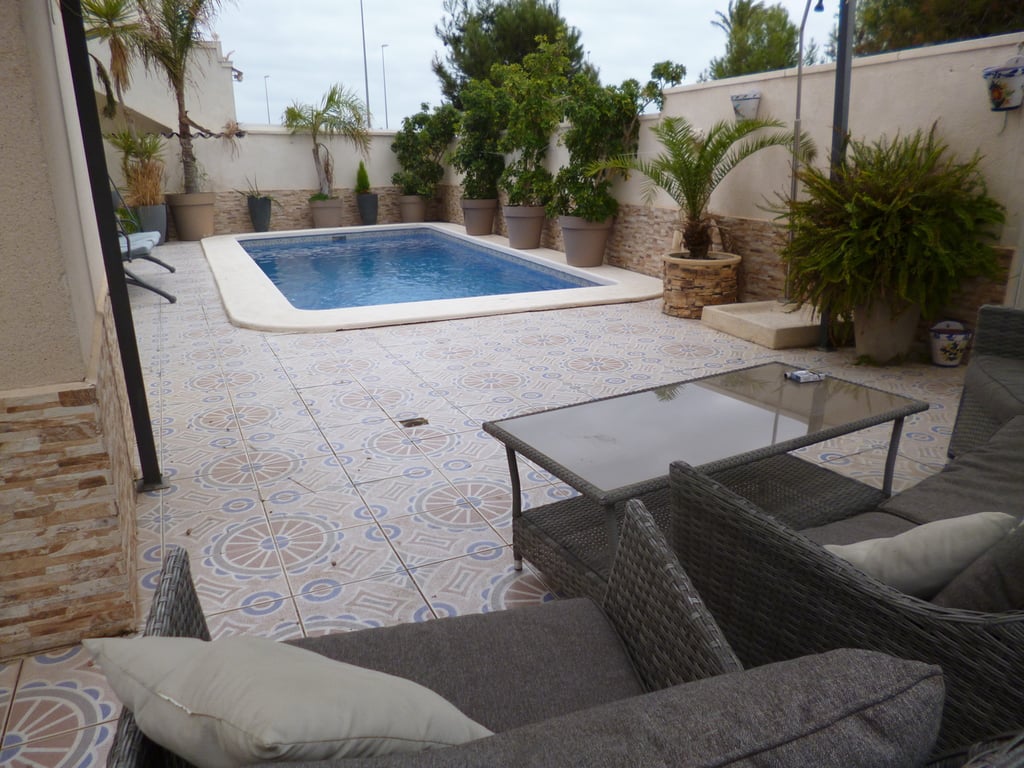 A beautiful San Jose Villa with 4 bedrooms 3 bathrooms and private swimming pool in Playa Flamenca between the La Zenia Boulevard and the popular Saturday market. The Villa has been modified and redecorated to a high standard. To the front is off street parking with a seating area. The garden is low maintenance with pot plants and mostly tiled. The patio doors is to the ground floor apartment / Annex with two bedrooms, bathroom, modern fitted kitchen, utility area and living room. The stairs from the front driveway take you to the rear garden and swimming pool with entrance to the main building. A conservatory seating area overlooking the swimming pool, the living room with gas fire and dining room with exit to seating area looking across the garden and swimming pool. A shower WC and modern fitted kitchen are off the living room. A doorway to the downstairs Annex and an archway to the upstairs bedrooms and solarium, the two bedrooms have ceiling fans, air conditioning, the master bedroom having a walk in wardrobe and seating area, looking out to the park and children’s play area. The top level is the solarium with its satellite dish and views of the surrounding area and the La Zenia Boulevard shopping centre.