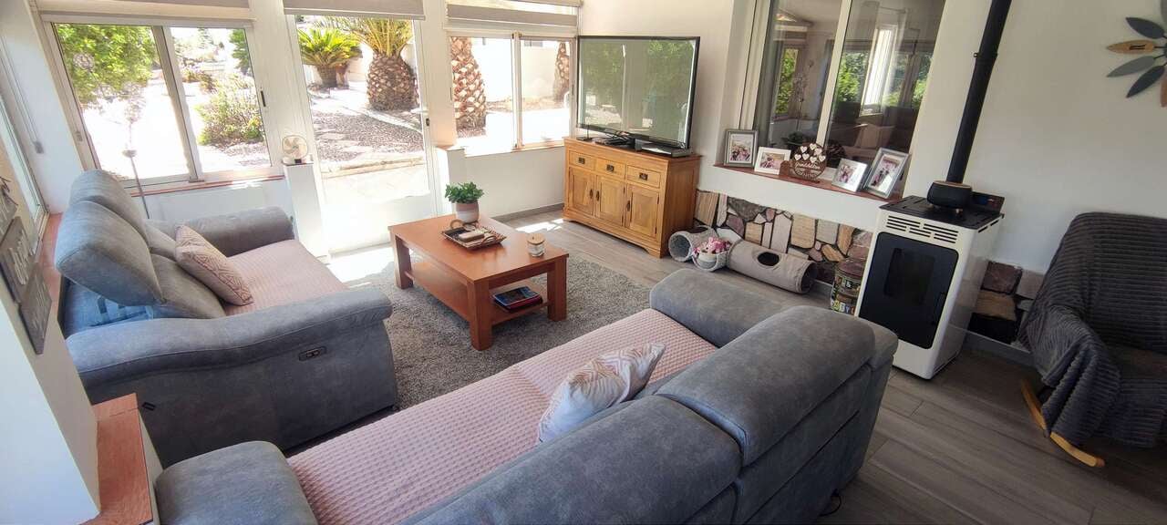 A Truly Unique Villa with Pool, Sports Facilities & Panoramic Views – Just Minutes from SaxWe are very proud to introduce this must-see 4-bedroom, 3-bathroom villa—a stunning blend of traditional Spanish charm and modern comforts, set in a peaceful location with breathtaking views, just 4 minutes from the historic town of Sax and 35 minutes from both the beach and Alicante airport.Set on a 1,792 m² fully fenced plot with tarmac access, this impressive 397 m² home offers a wealth of features that make it ideal for both permanent living and luxurious holiday escapes.Step inside and be immediately impressed by the tastefully modernised interior, while the villa retains its traditional Spanish character. With two pellet burners and oil central heating (700L tank), you’ll stay cosy in winter—while the private 10x5m pool and extensive outdoor entertainment area make summer unforgettable. For the active family, enjoy your very own 5-a-side football pitch and a 5-hole crazy golf course—perfect for entertaining both kids and adults alike!Hosting guests? They’ll be wowed by the bar area, fully equipped summer kitchen with built-in BBQ, and alfresco dining space for those magical evenings under the stars. The beautifully designed entertainment area is made for fiestas and unforgettable memories.Additional features include:4 convenient storage roomsLarge garageCharming casita for guests, hobbies, or office usePrivate well for sustainable water supplyFruit trees adding a Mediterranean touchAll of this in a peaceful, scenic location with panoramic views from your pool and garden—yet within easy reach of local amenities, beaches, and the airport.Key DistancesSax – 4 min Alicante Airport – 35 minCosta Blanca Beaches – 35 minThis is not just a home—it’s a lifestyle. Whether you’re relocating for a slower pace of life, investing in a holiday home, or dreaming of entertaining family and friends under the Spanish sun, this villa delivers on every level.Book your viewing today—properties with this level of character, space, and features rarely stay on the market for long.